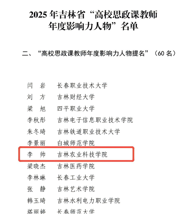 经学校推荐、专家评审和公示等环节,我院教师李帅荣获2025年吉林省高校思政课教师年度影响力人物提名。
