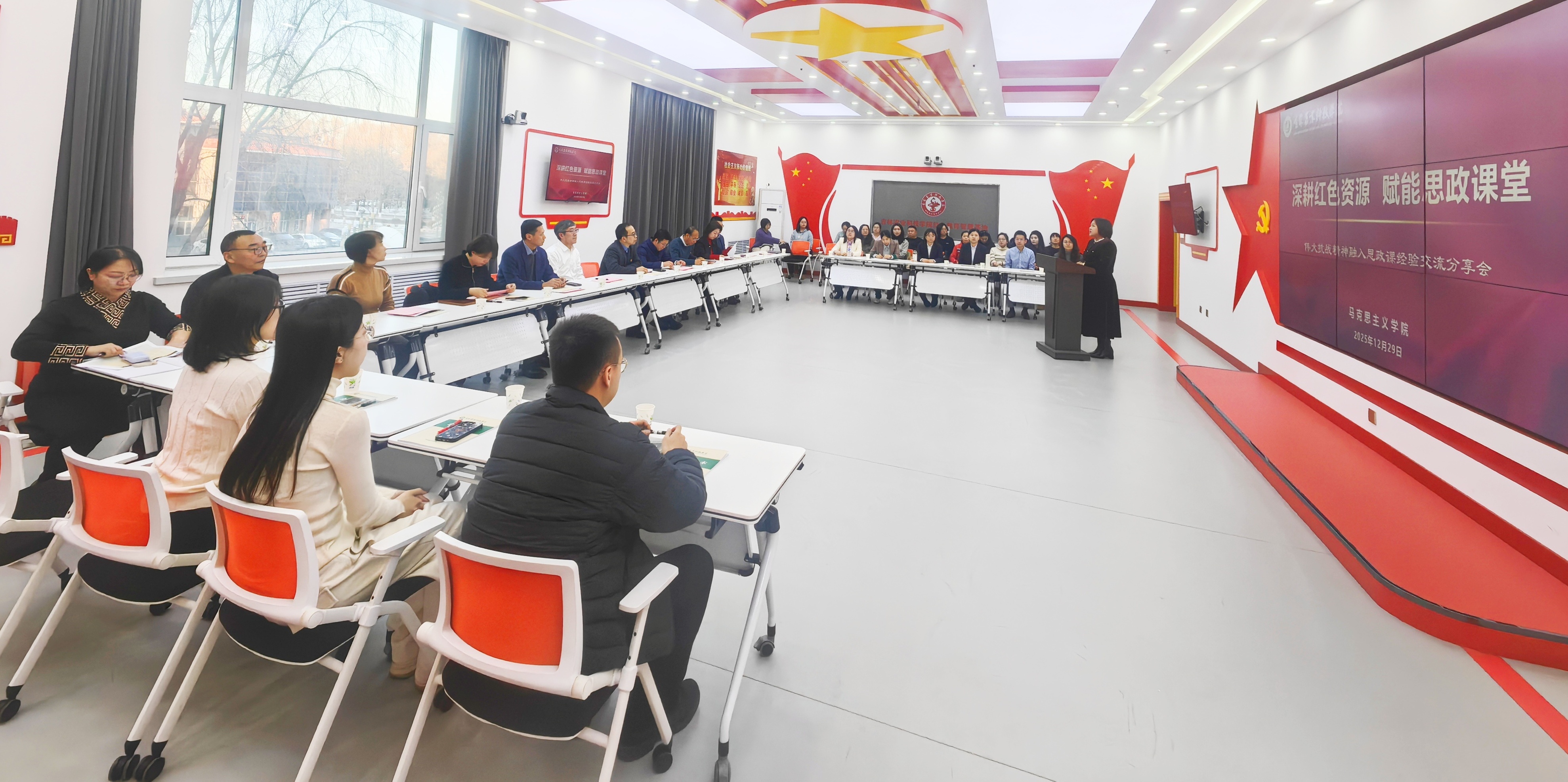 为深入挖掘红色资源时代价值,推动伟大抗战精神与思政课教学深度融合,切实增强思政课的思想性、理论性和亲和力、针对性,12月29日下午,马克思主义学院在红色教育智慧基地召开“深耕红色资源 赋能思政课堂”暨伟大抗战精神融入思政课经验交流分享会。学校党委书记毛彦军、校长尹柏双、党委副书记王怀忠、党委副书记许洪波、副校长潘力、副校长赵悦及全体思政课教师参加此次分享会,会议由马克思主义学院院长张旭主持。 分...